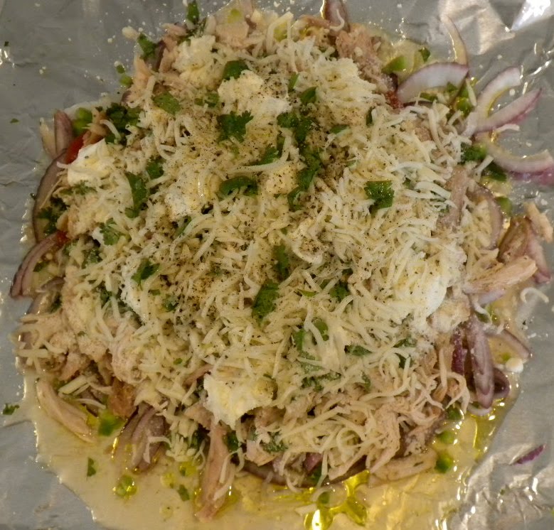 On a double sheet of foil, layer (in this order), the oil, onions, jalapeno, red bell peppers, chicken, salt and pepper, garlic, cilantro, cheeses, lemon juice and tequila.